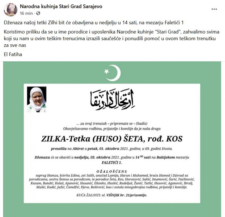 Dženaza tetki Zilhi, koja je preminula danas, bit će klanjana u nedjelju, u 14 sati, na mezarju Faletići u Sarajevu.
