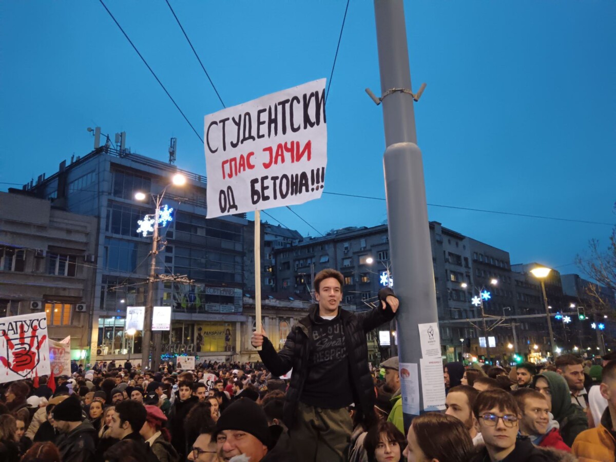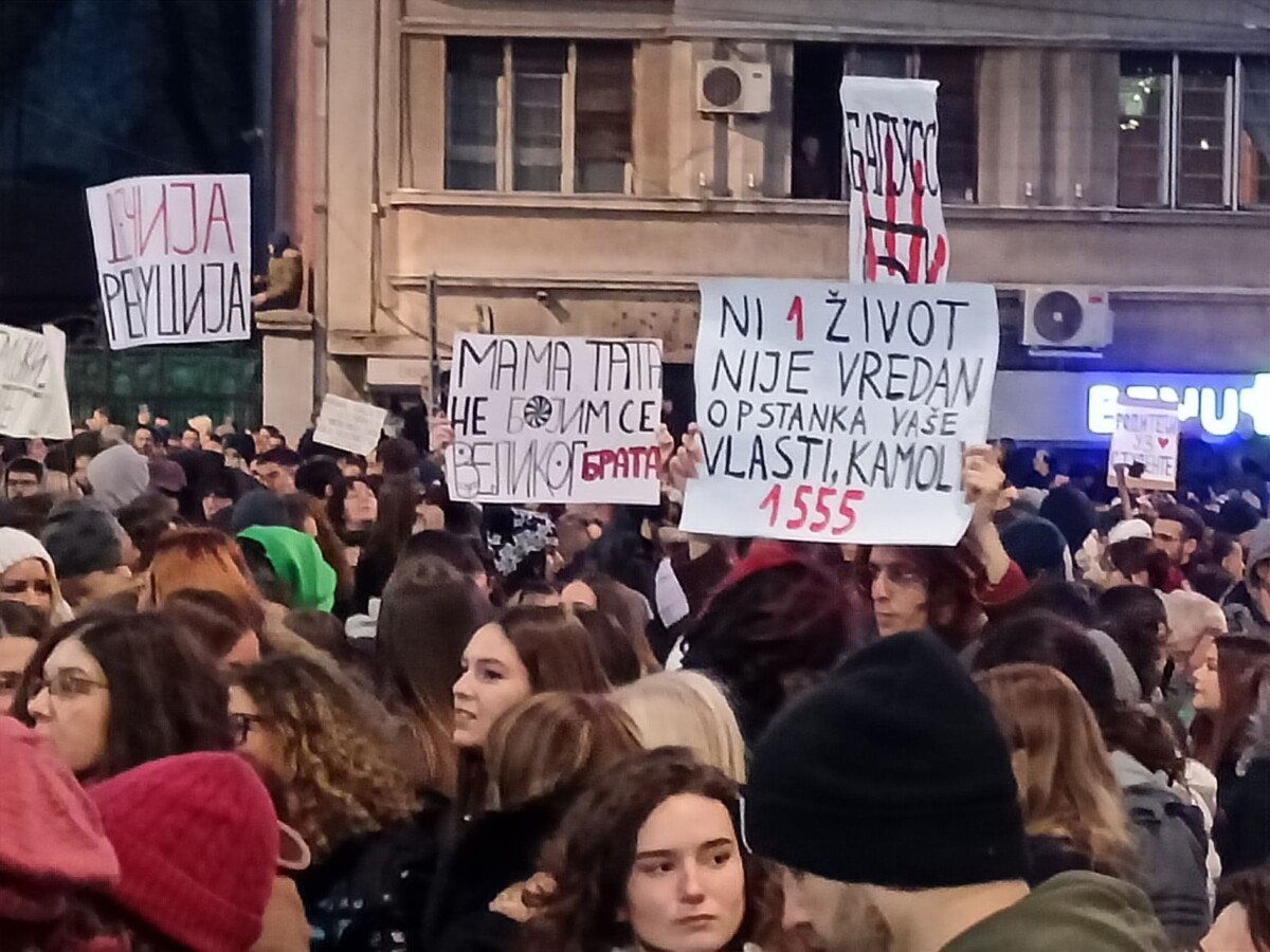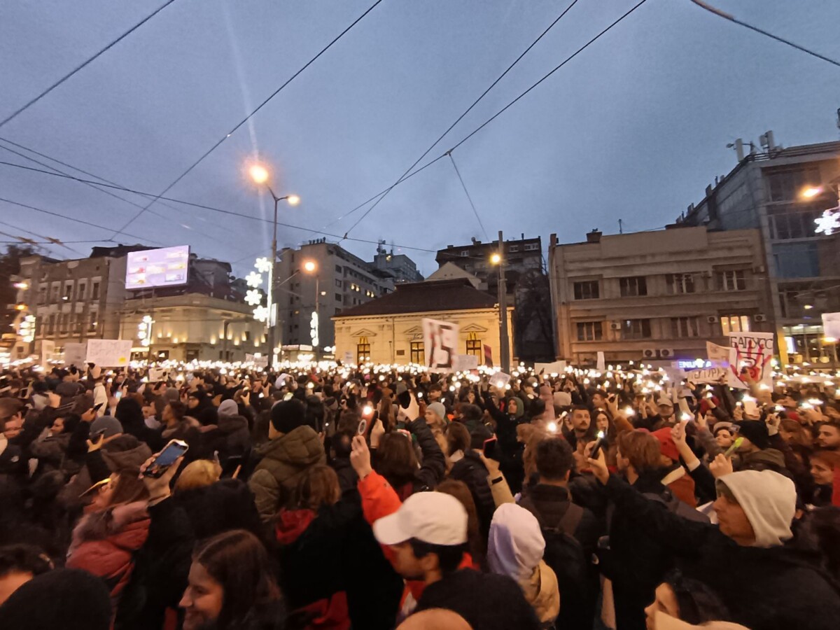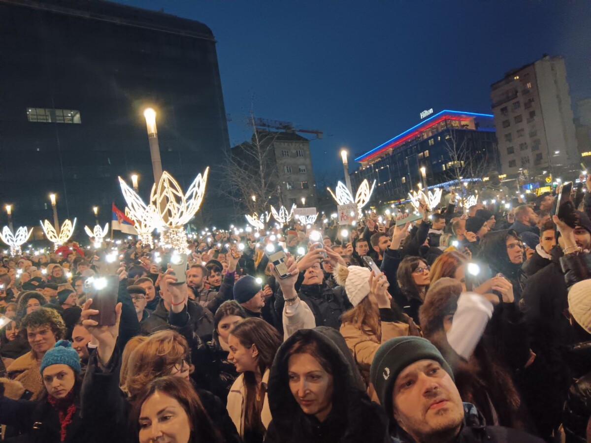 Kolone ljudi počele su pristizati na centralni trg “Slavija” još 16 sati kada je skup i zvanično počeo, a studenti, učenici i poljoprivrednici sa sobom su nosili i brojne poruke i transparente od kojih se najviše ističe onaj s natpisom “Beograd je opet svet”.