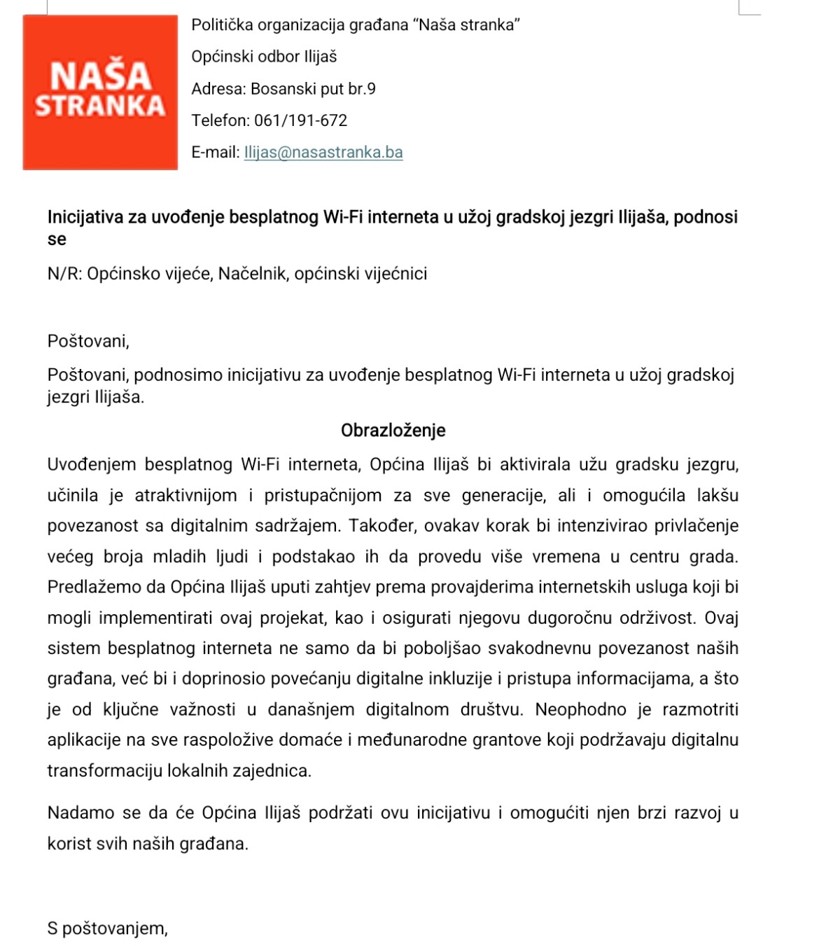 Naša stranka Ilijaš pokrenula je inicijativu za uvođenje besplatnog Wi-Fi interneta u užoj gradskoj jezgri, upućenu Općinskom vijeću i načelniku.
