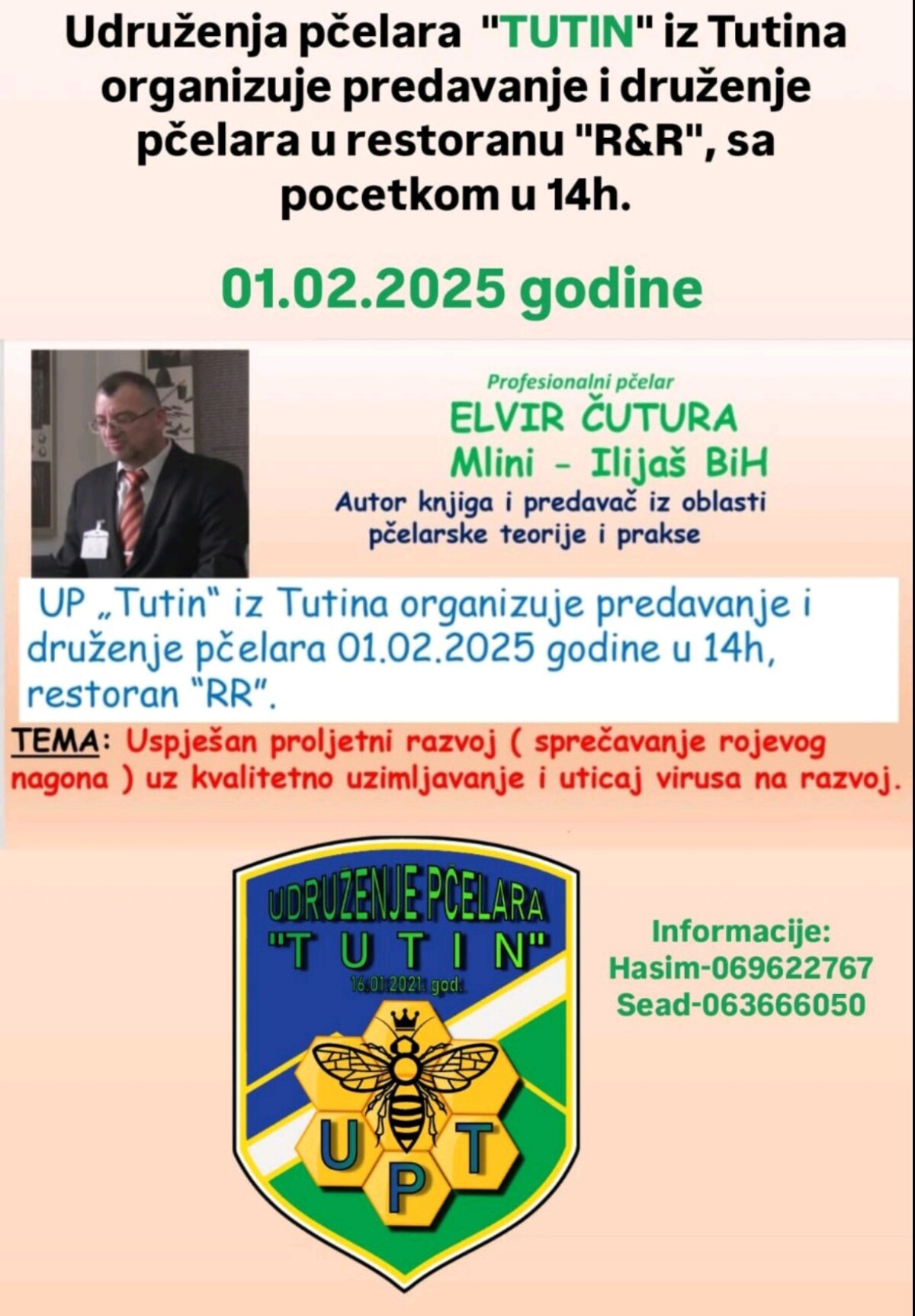 Zatim, 2. februara 2025. godine UP “Tutin” iz Tutina poziva sve ljubitelje pčela na predavanje “Siguran proljetni razvoj pčelinjih zajednica”. Događaj će pružiti praktične savjete o pripremi pčela za proljeće, optimizaciji razvoja zajednica i rješavanju izazova povezanih s klimatskim promjenama.