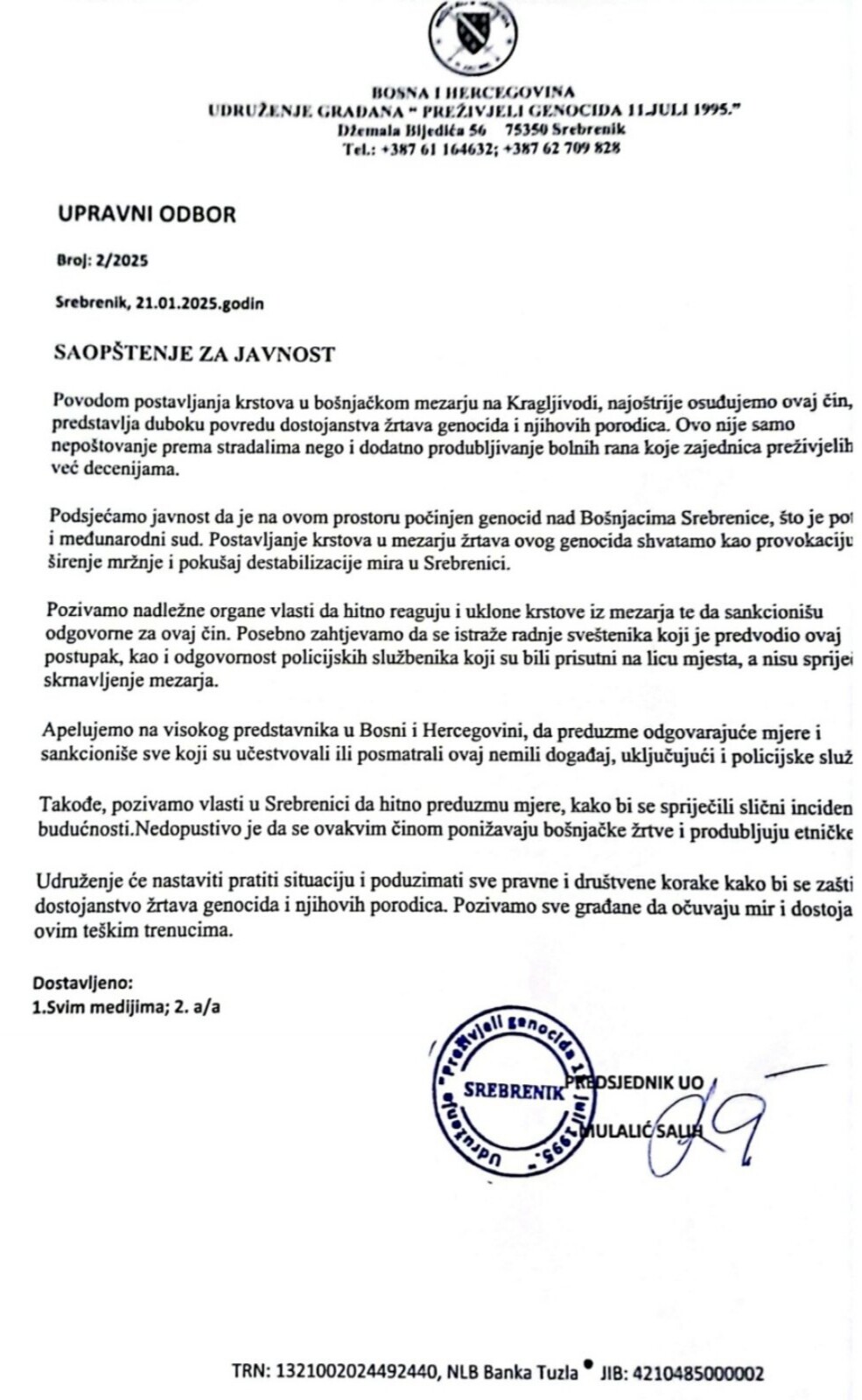 “Povodom postavijanja krstova u bošnjačkom mezarju na Kragljivodi, najoštrije osuđujemo ovaj vandalski čin, koji predstavija duboku povredu dostojanstva žrtava genocida i njihovih porodica. Ovo nije samo nepoštivanje prema stradalima nego i dodatno produbljivanje bolnih rana koje zajednica preživjelih nosi već decenijama.