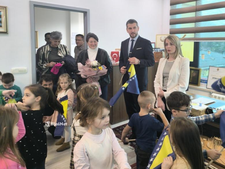 Odgajateljice i mališane iz najstarije odgojne grupe, koja inače broji 27 djece, ugostili su općinski načelnik Amar Dovadžija, pomoćnica načelnika u Službi za društvene djelatnosti i poslove mjesnih zajednica Sanja Zagorac-Jozić i stručna savjetnica za obrazovanje, mlade i NVO Enisa Mešetović.