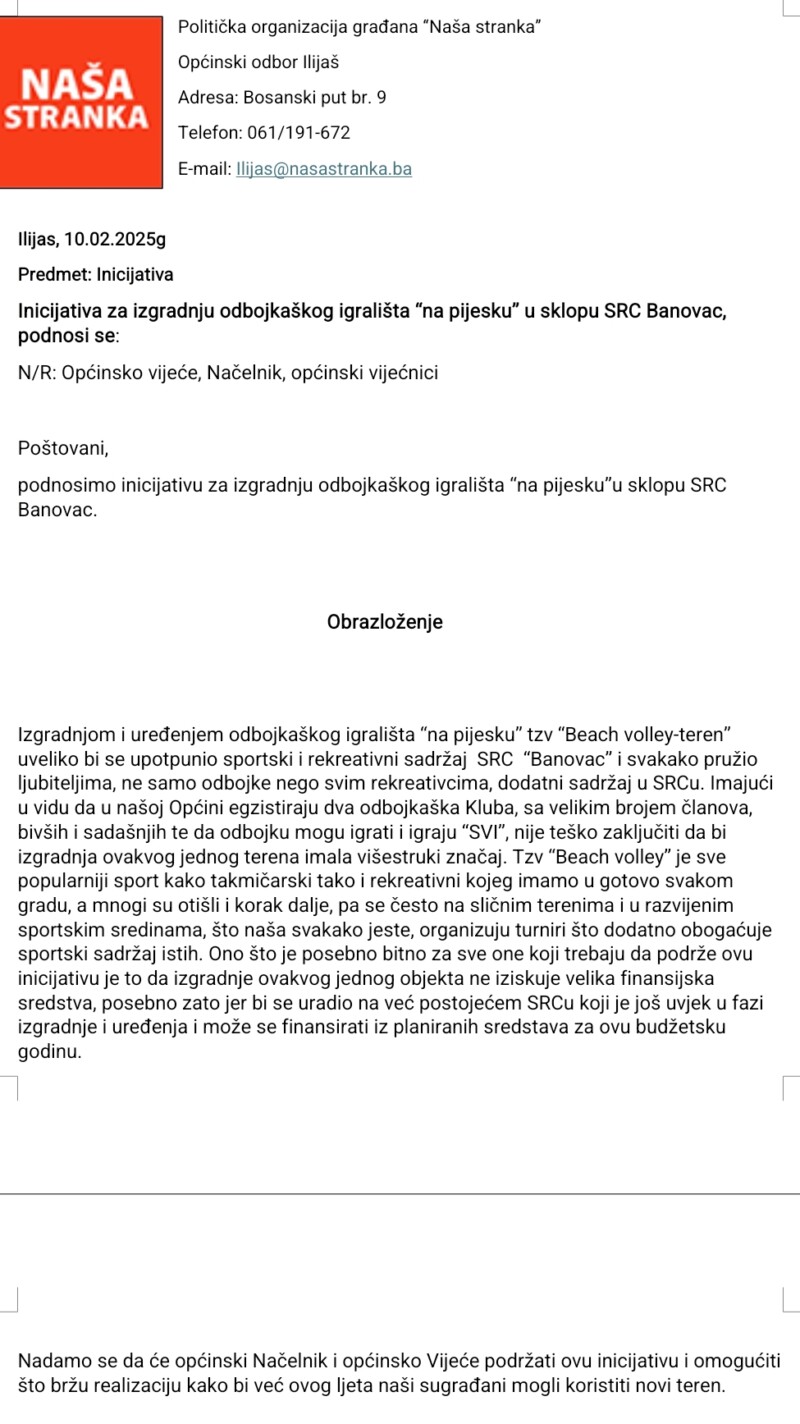 Vijećnica Naše stranke u Općinskom vijeću Ilijaš Mirzeta-Kašić Lelo podnijela je inicijativu za izgradnju odbojkaškog igrališta “na pijesku” u sklopu SRC Banovac.