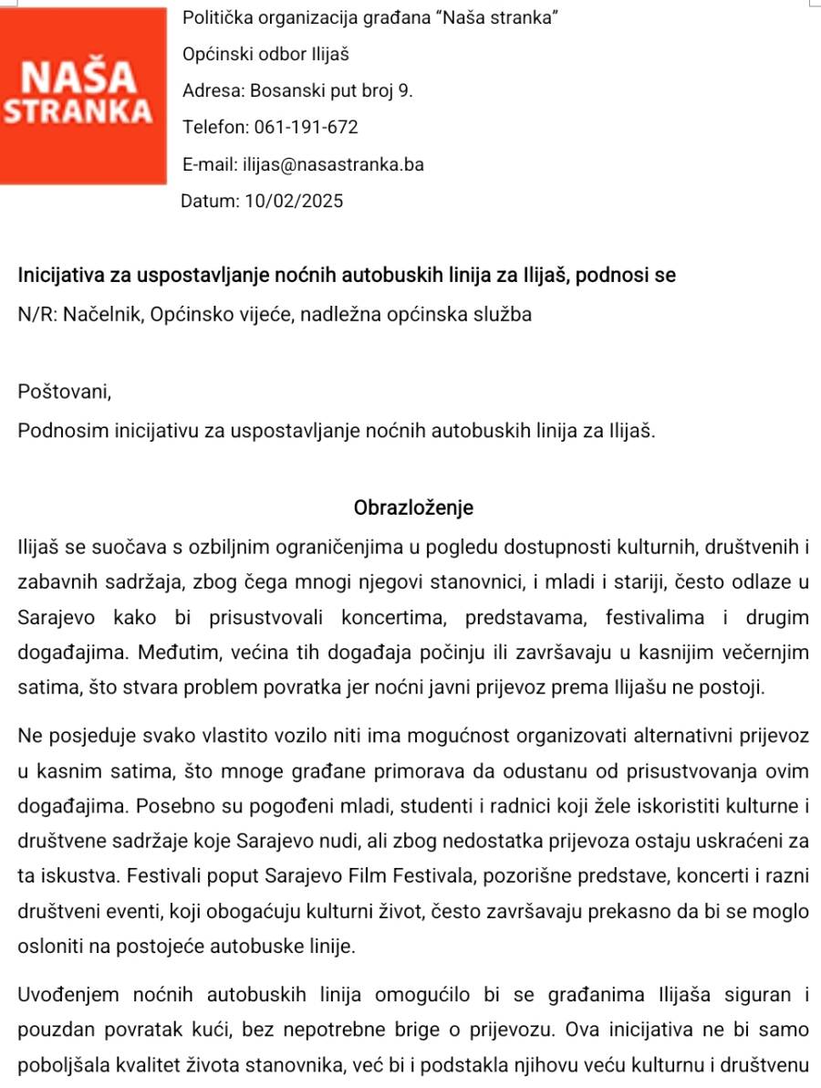 Naša Stranka Ilijaš: Građani Ilijaša suočavaju se s velikim izazovom – nedostatkom noćnog javnog prijevoza. Zbog toga, mnogi su primorani da odustanu od kulturnih i društvenih događaja u Sarajevu jer nemaju mogućnost povratka kući u kasnim satima.