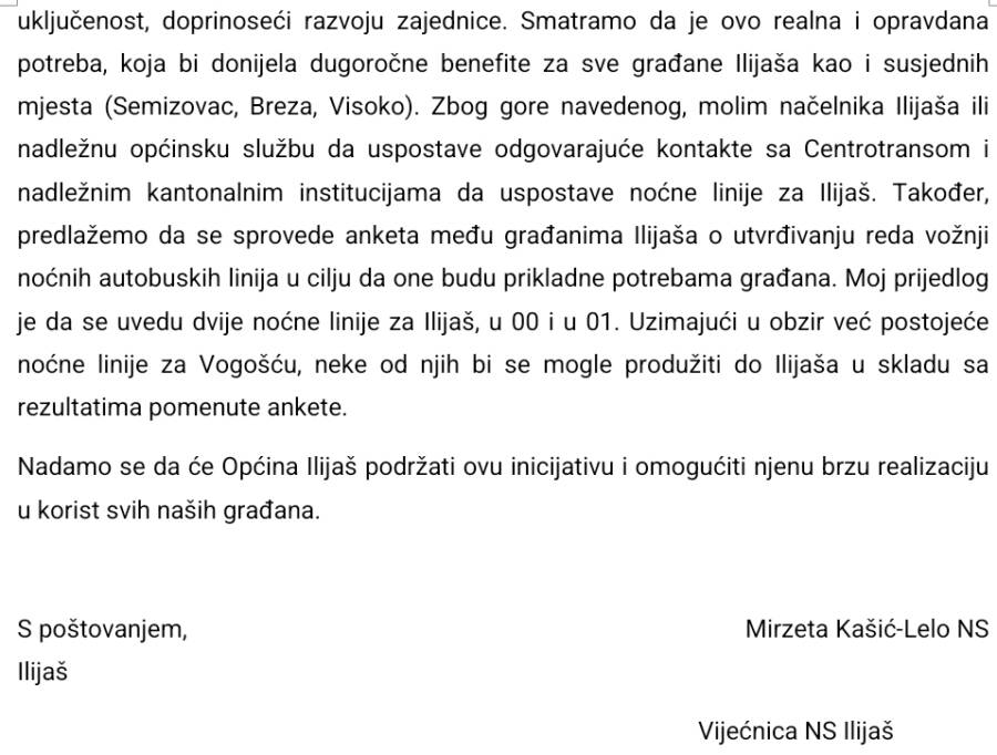 Mirzeta Kašić-Lelo: Predlažemo uvođenje noćnih autobusnih linija koje bi omogućile siguran i pouzdan povratak građanima Ilijaša, Semizovca, Breze i Visokog. Smatramo da je ovo važan korak u poboljšanju kvalitete života i jačanju kulturne uključenosti.