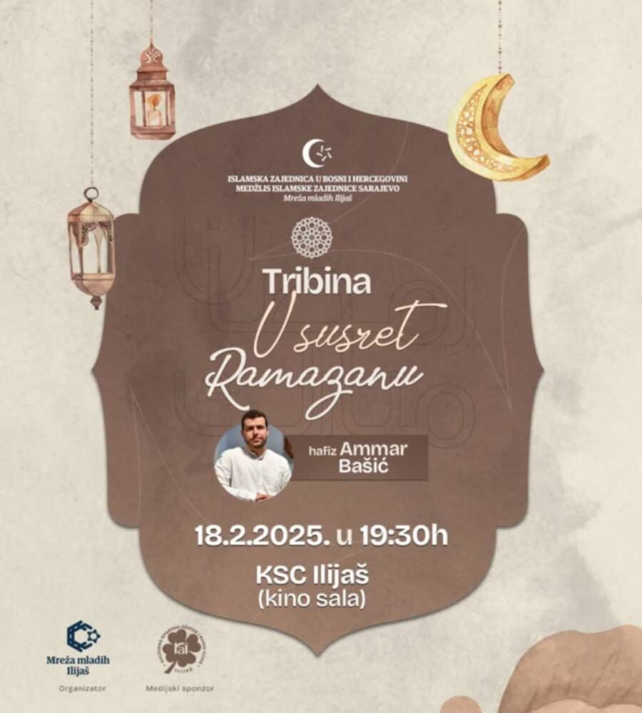 Islamska zajednica u Bosni i Hercegovini, Medžlis IZ Sarajevo, Mreža mladih Ilijaš organizuju Tribinu „U susret Ramazanu“ sa hafizom Ammarom Bašićem u utorak 18. februara 2025. godine sa početkom u 19:30 sati u kino sali KSC Ilijaš.