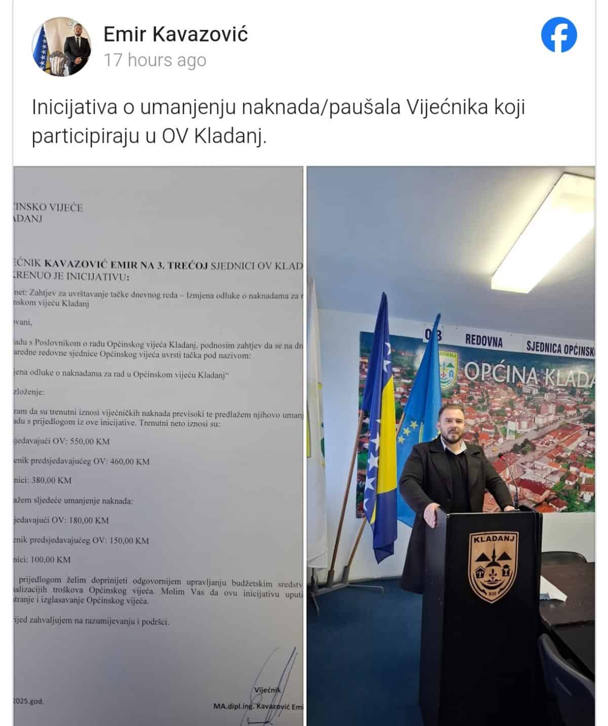 Inicijativa vijećnika Kavazović Emira, sastoji se od izmjena odluke o naknadama za rad u Općinskom vijeću Kladanj, odnosno da umjesto 550,00 KM bude 180,00 KM za predsjedavajućeg Općinskog vijeća, 460,00 KM bude 150,00 KM za zamjenika, te za vijećnike koji sada primaju 380,00 KM bude 100,00 KM. Općinsko vijeće Kladanj trenutno čine: SDA (5), PDA (2), DF (2), SDP (2), Nezavisna lista (2), NiP (1), Snaga naroda (1), BPS (1) i SDBiH (1.)