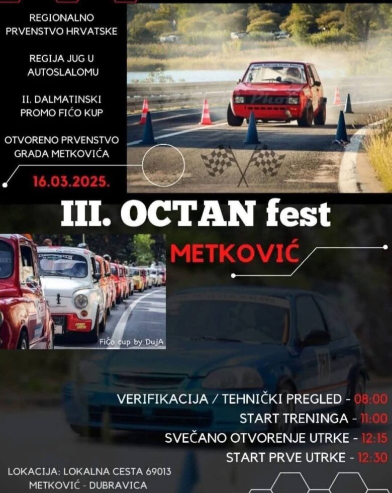 Sezona automoto utrka polahko počinje, a dok se u Bosni i Hercegovini još čeka na prvo takmičenje ove godine, naše komšije u Hrvatskoj već u nedjelju, 16. marta 2025., organizuju veliki događaj — III OCTAN fest Metković. Ovo takmičenje u disciplini autoslalom, dio je “II. Dalmatinskog Promo Fićo Kupa” i “Otvorenog prvenstva grada Metkovića”, a organizuje ga Auto Klub Metković.