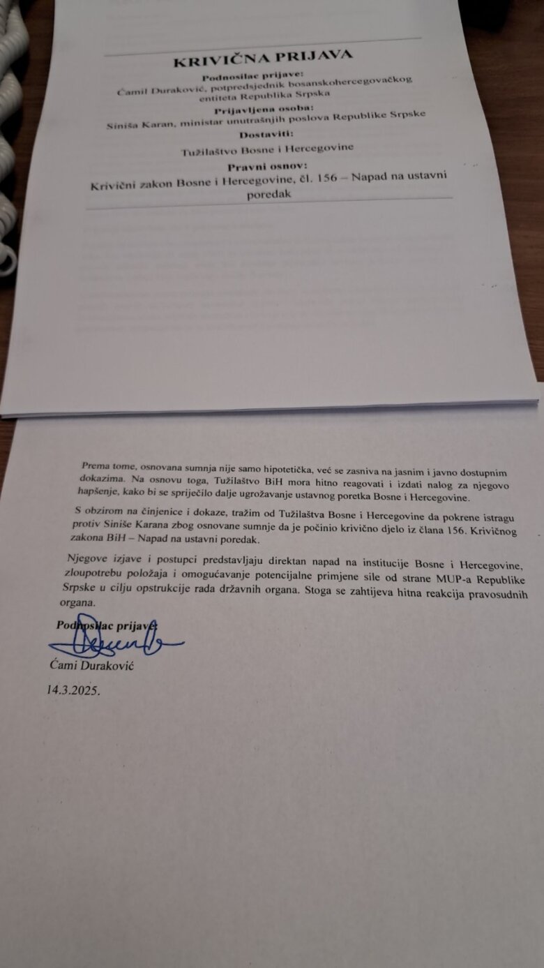 Ćamil Duraković, potpredsjednik Republike Srpske, podnio je Tužilaštvu Bosne i Hercegovine krivičnu prijavu protiv Siniše Karana, ministra unutrašnjih poslova Republike Srpske, zbog prijetnji napadom na ustavni poredak. Prijava se temelji na članu 156. Krivičnog zakona BiH, koji predviđa zatvorsku kaznu od najmanje pet godina za pokušaj promjene ustavnog poretka upotrebom sile ili prijetnjom sile.