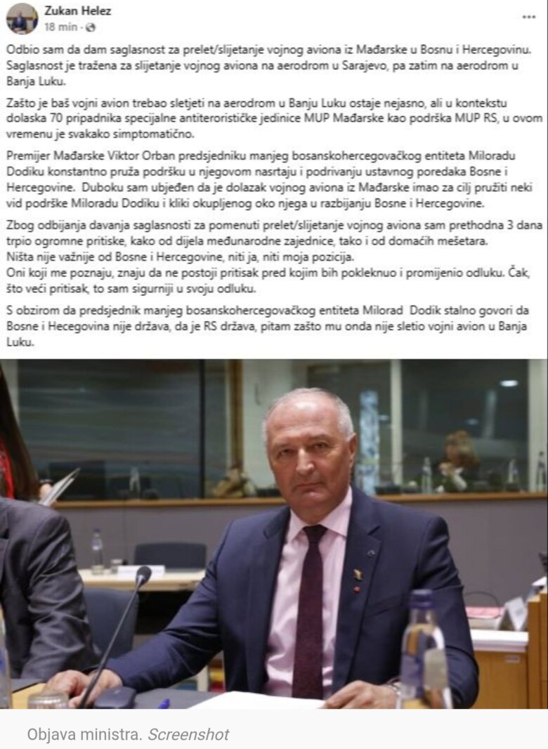 – Zašto je baš vojni avion trebao sletjeti na aerodrom u Banju Luku ostaje nejasno, ali u kontekstu dolaska 70 pripadnika specijalne antiterorističke jedinice MUP Mađarske kao podrška MUP RS, u ovom vremenu je svakako simptomatično. Premijer Mađarske Viktor Orban predsjedniku manjeg bosanskohercegovačkog entiteta Miloradu Dodiku konstantno pruža podršku u njegovom nasrtaju i podrivanju ustavnog poredaka Bosne i Hercegovine. Duboku sam ubjeđen da je dolazak vojnog aviona iz Mađarske imao za cilj pružiti neki vid podrške Miloradu Dodiku i kliki okupljenog oko njega u razbijanju Bosne i Hercegovine – naveo je Helez.
