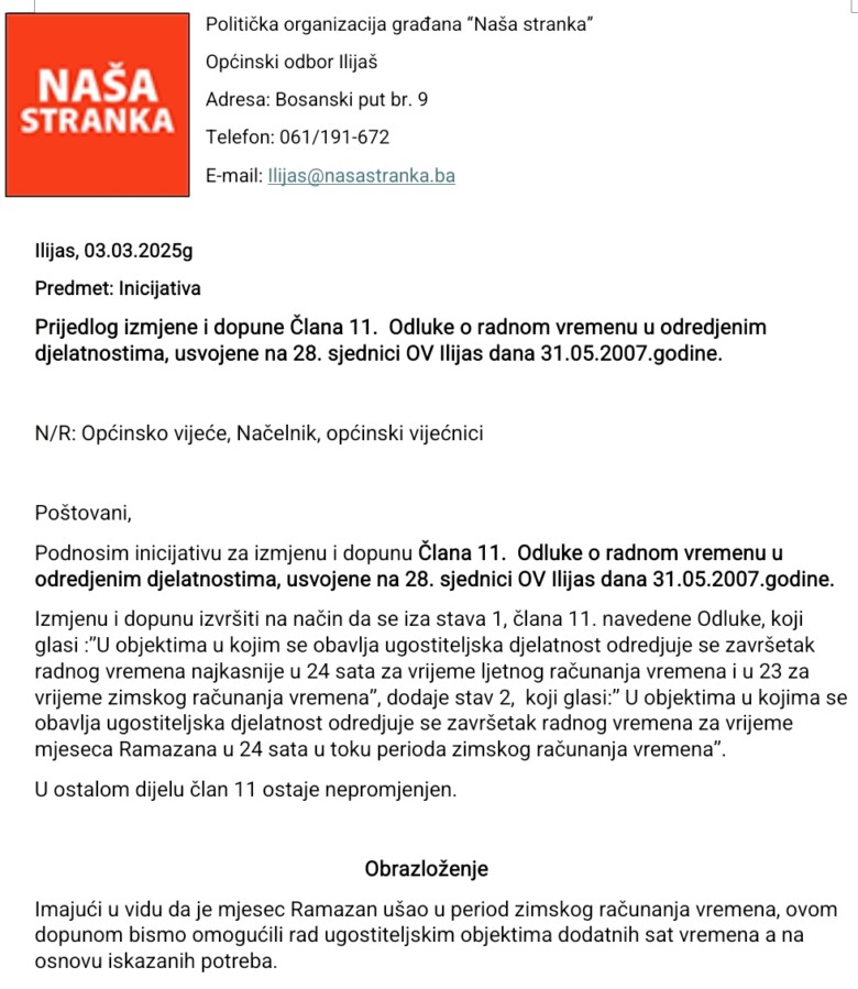 Naša stranka Ilijaš podnijela je, na današnjoj 5. redovnoj sjednici Općinskog vijeća Ilijaš, inicijativu za dopunu Člana 11. Odluke o radnom vremenu u određenim djelatnostima, usvojene na 28. sjednici OV Ilijaš dana 31.05.2007.godine.