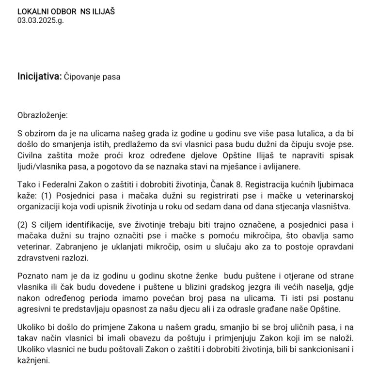 Također, da je ovaj problem bitan dokaz je i nedavno pokrenuta i upućena inicijativa ispred Naše stranke Ilijaš (slika ispod) kojom se traži “čipovanje pasa”.