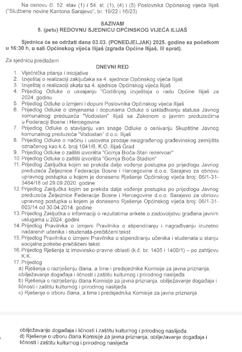 Za ponedjeljak, 03.03.2025. godine zakazana je 5. redovna sjednica Općinskog vijeća Ilijaš, na kojoj će se, između ostalog, razmatrati Prijedlog Odluke o izmjeni i dopuni Poslovnika Općinskog vijeća Ilijaš, Prijedlog Odluke o izmjenama i dopunama statusa Javnog komunalnog preduzeća „Vodostan“ Ilijaš sa Zakonom o javnim preduzećima u Federaciji Bosne i Hercegovine i Prijedlog Odluke o stavljanju van snage Odluke o osnivanju Skupštine Javnog komunalnog preduzeća „Vodostan“ d.o.o. Ilijaš.