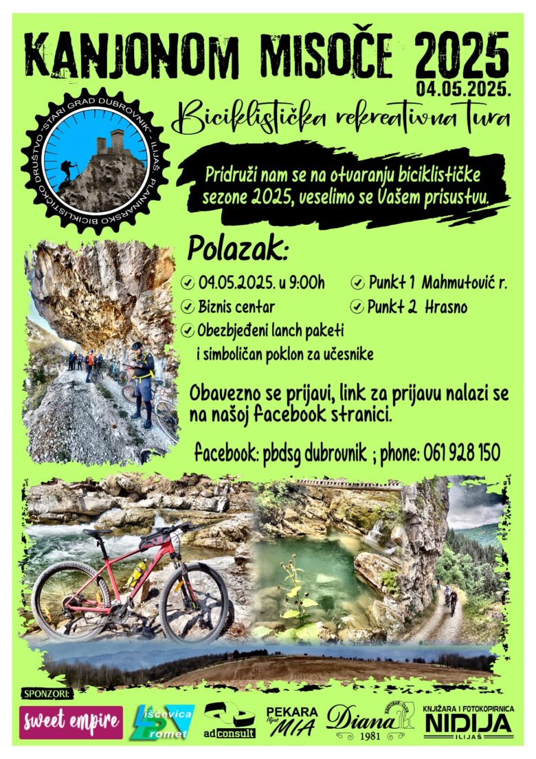 Planinarsko-biciklističko društvo “Stari Grad” Dubrovnik Ilijaš organizuje biciklističku rekreativnu turu „Kanjonom Misoče 2025“, koja će se održati u nedjelju, 4. maja 2025. godine, s početkom u 9:00 sati.