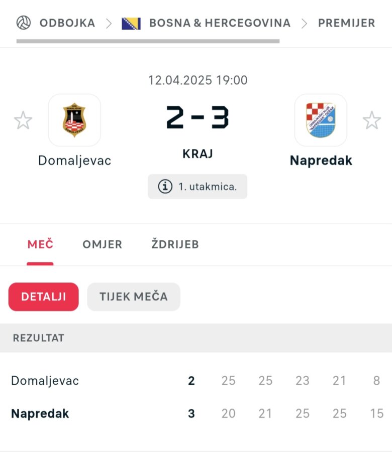 U prvoj finalnoj utakmici za prvaka BiH odigranoj sinoć, 12.4.2025. u Orašju, gostujuća ekipa OK “Napredak” Odžak pobijedila je ekipu HOK “Magic Ice” Domaljevac sa 3:2.