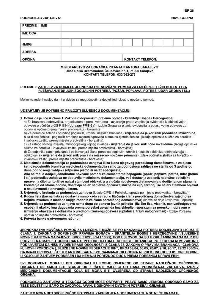 Ministarstvo za boračka pitanja Kantona Sarajevo omogućilo je podnošenje zahtjeva za dodjelu jednokratne novčane pomoći u 2025. godini za liječenje težih bolesti, saniranje posljedica elementarnih nepogoda (požar, poplava, potres, udar groma) i druge hitne socijalne potrebe.