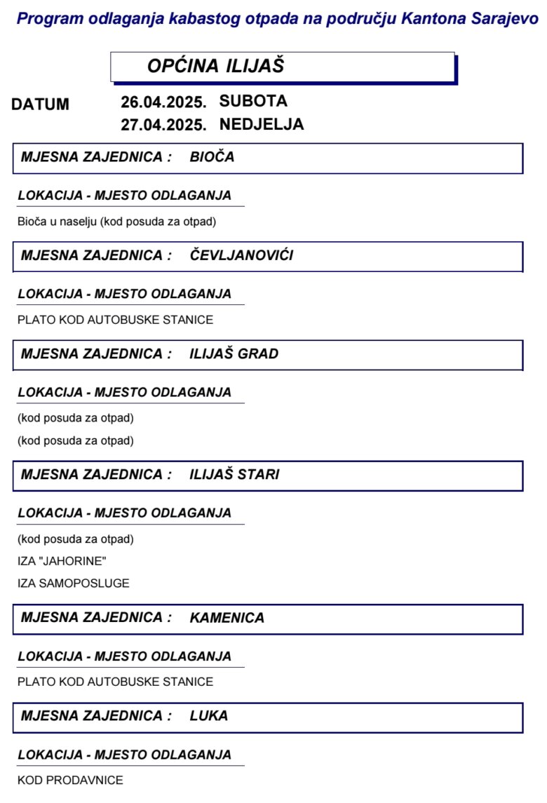 Proljetna akcija prikupljanja kabastog otpada na području općine Ilijaš planirana je u subotu i nedjelju 26. i 27. aprila 2025. godine, obavijestili su iz KJKP Rad.