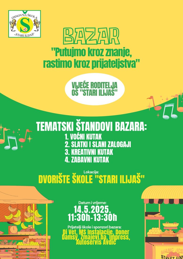 Pozivamo vas da sutra budete dio našeg humanitarnog školskog bazara koji će se održati od 11:30 do 13:30h u dvorištu OŠ “Stari Ilijaš”! Osim što ćete imati priliku dati dobrovoljni prilog i poslužiti se svježim voćem i slatkim poslasticama, moći ćete učestvovati u zabavnim igrama koje smo pripremili i okušati sreću u osvajanju fantastičnih nagrada!