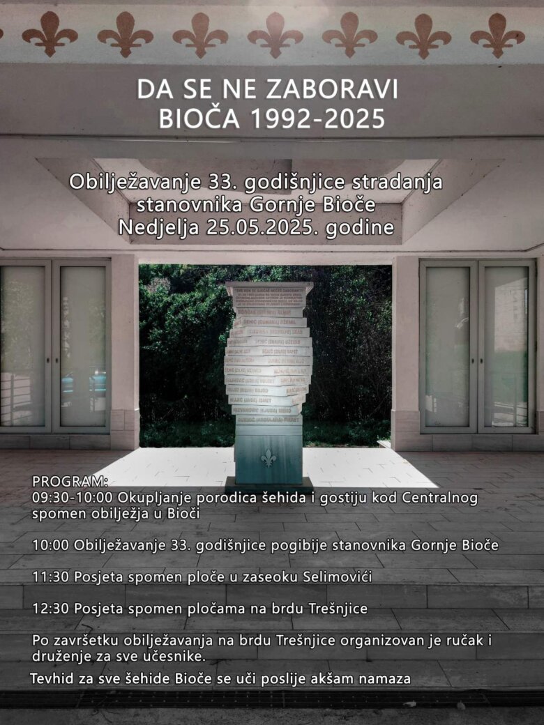 U nedjelju 25.05.2025. godine, nedjelja, planirano je obilježavanje 33. godišnjice stradanja stanovnika Gornje Bioče.