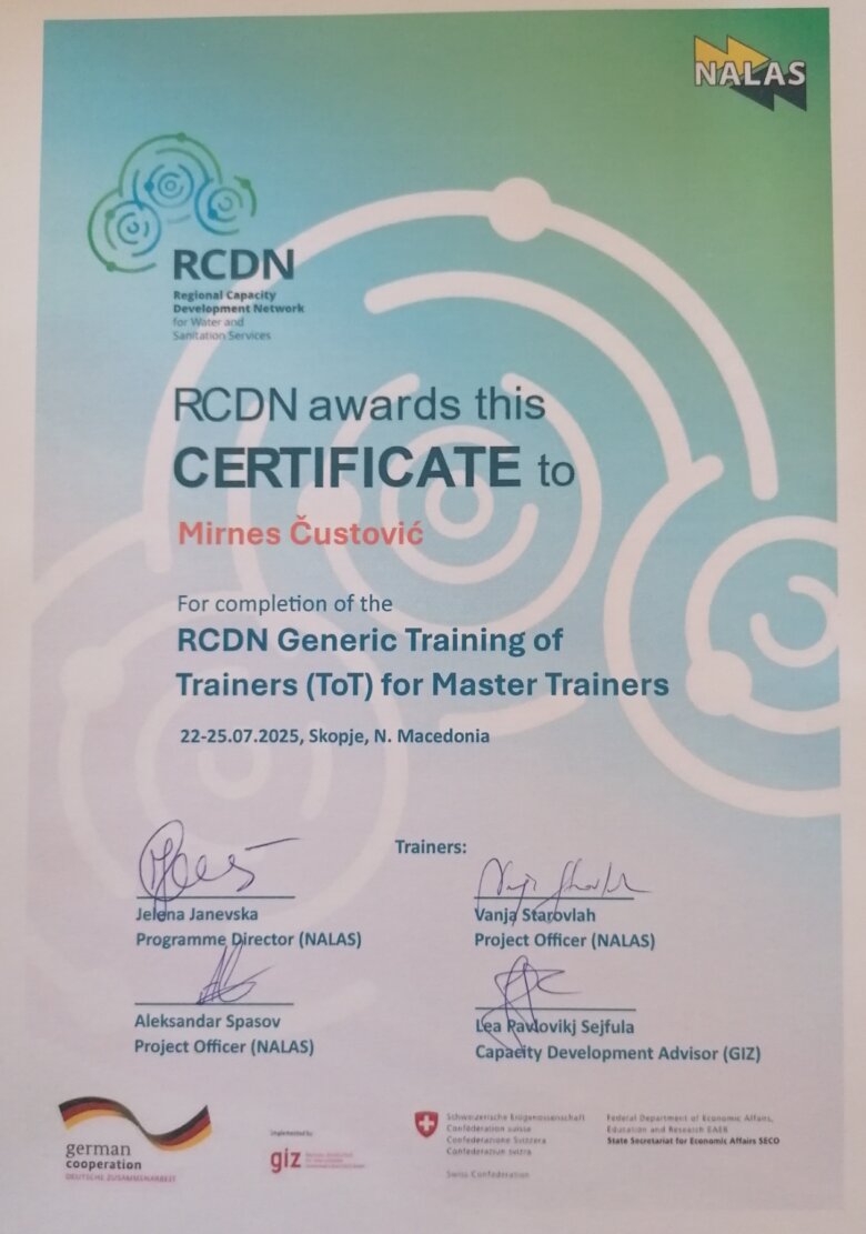 Regionalna mreža za razvoj kapaciteta u sektoru voda i sanitarne infrastrukture (RCDN) uspješno je završila drugu “Master obuku trenera” s ciljem jačanja stručnih kapaciteta u oblasti upravljanja vodama na Zapadnom Balkanu.