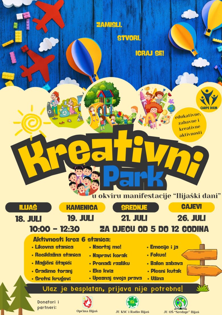Udruženje Omladinska organizacija “Iskoristi dan – Carpe diem” organizuje jedinstvenu dječiju manifestaciju pod nazivom „Kreativni park“, namijenjenu djeci uzrasta od 5 do 12 godina, koja će se održati na četiri različite lokacije na području općine Ilijaš.
