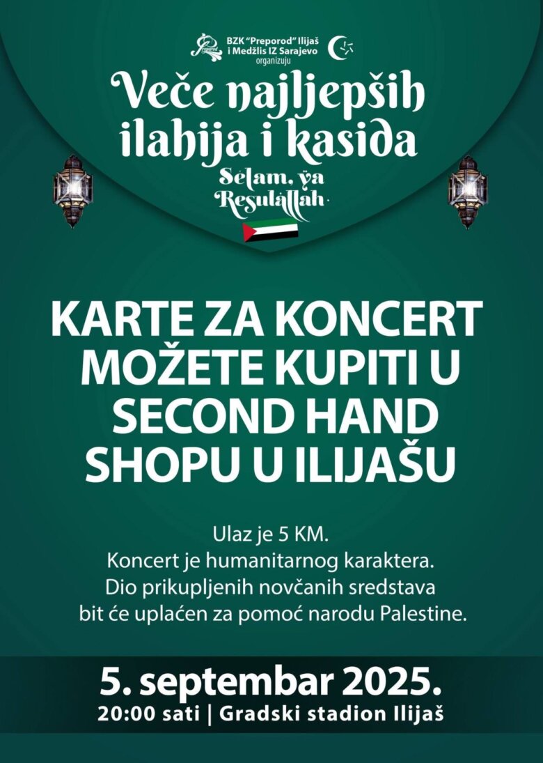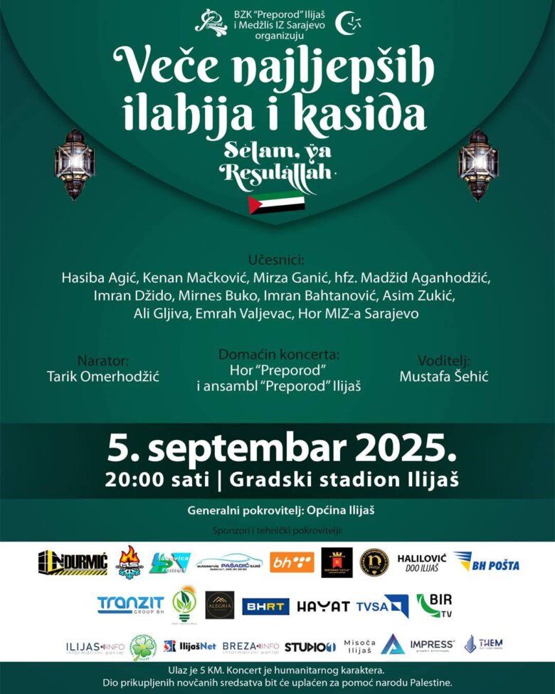 U organizaciji BZK “Preporod” Ilijaš i Medžlisa Islamske zajednice Sarajevo, 5. septembra 2025. godine na Gradskom stadionu u Ilijašu, s početkom u 20:00 sati, bit će održan 20. tradicionalni koncert “Veče najljepših ilahija i kasida”. Koncert se održava u sklopu manifestacije “Dani o Allahovom Poslaniku – Sellam ya Resulallah”.