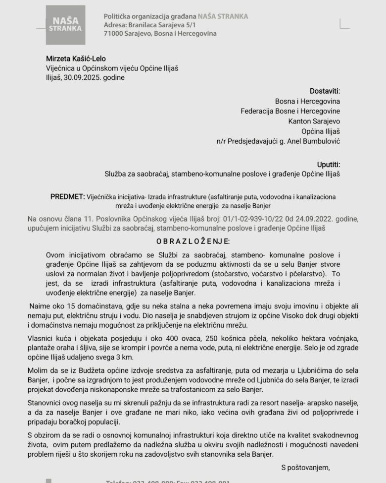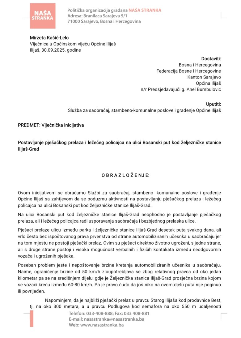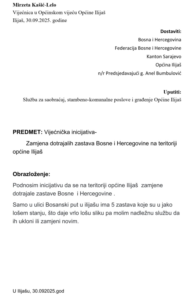 Dr. sc. Mirzeta Kašić-Lelo, vijećnica Naše stranke Ilijaš, podnijela je na današnjoj sjednici Općinskog vijeća Ilijaš tri inicojative.