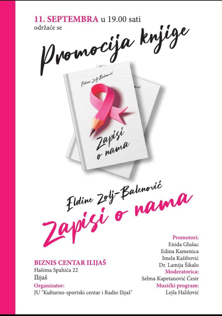 Javna ustanova “Kulturno-sportski centar i Radio Ilijaš” organizuje promociju knjige “Zapisi o nama” autorice Eldine Zolj Balenović u četvrtak 11. septembra 2025. godine sa početkom u 19:00 sati.