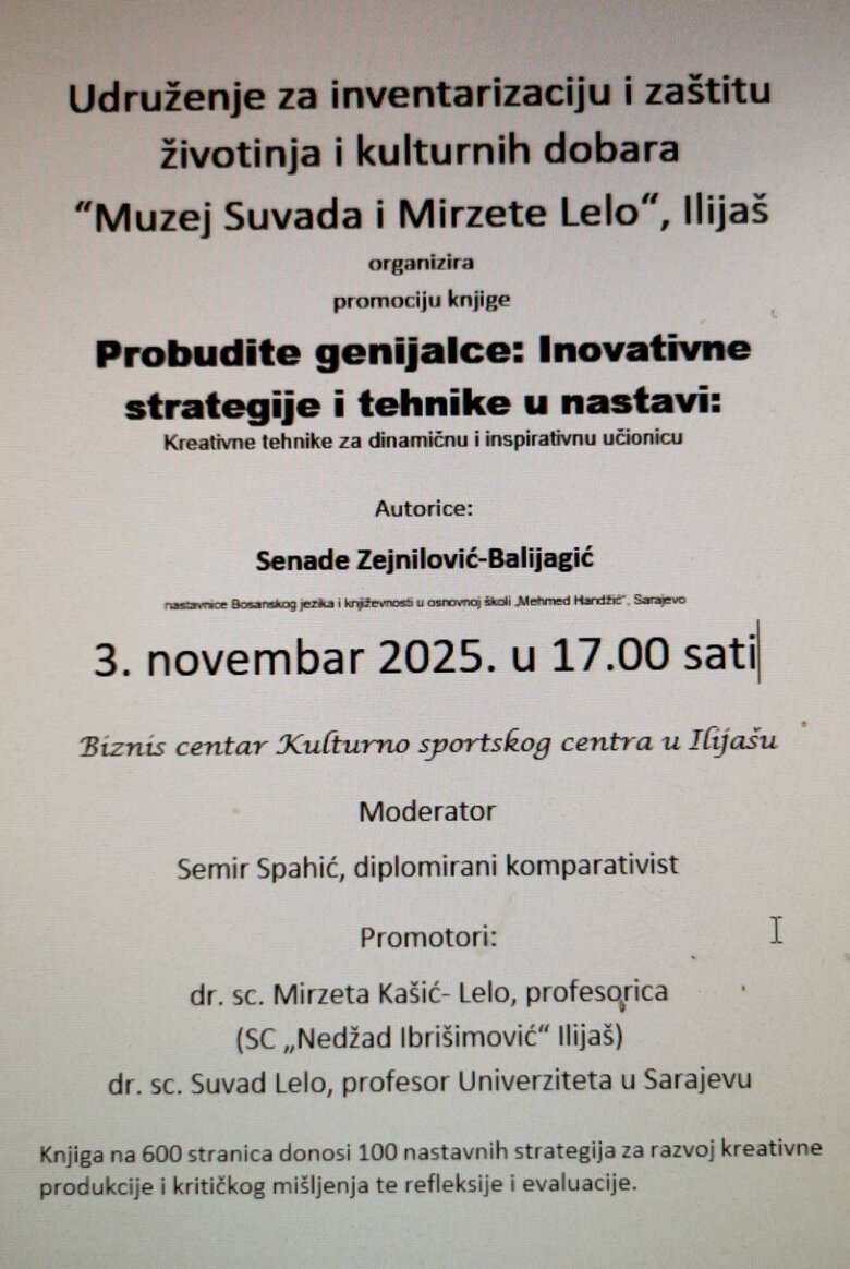 Pozivaju se svi nastavnici, edukatori, roditelji i ljubitelji knjige na svečanu promociju djela “Probudite genijalce: Inovativne strategije i tehnike u nastavi” autorice Senade Zejnilović-Balijagić.