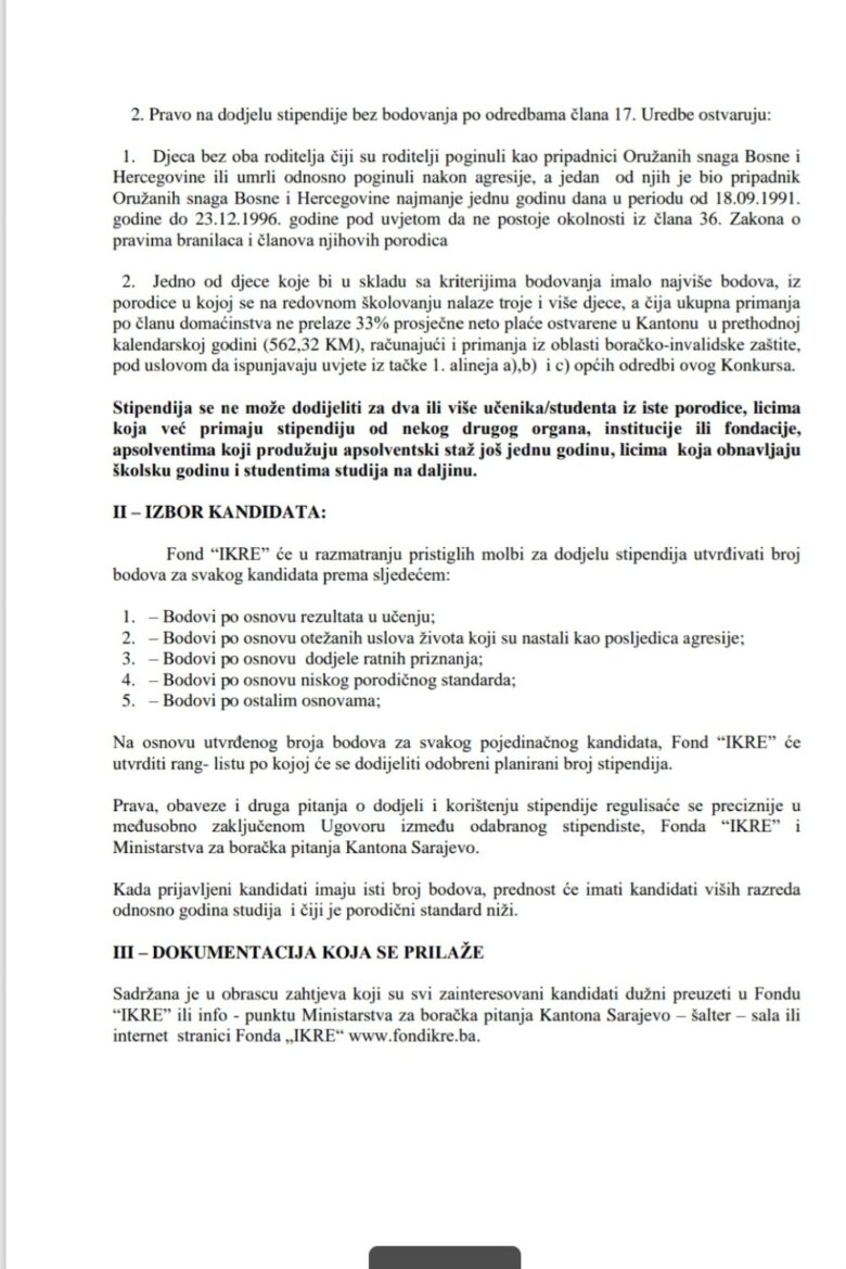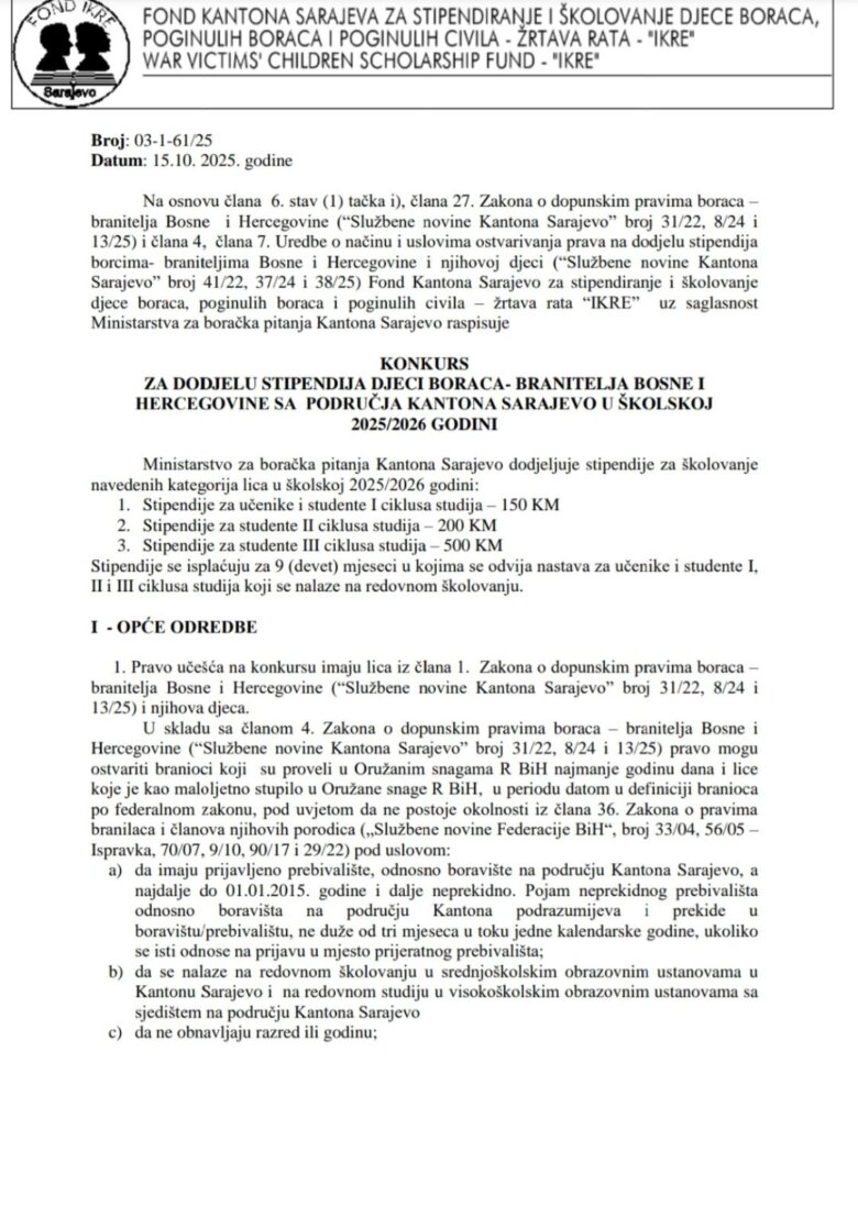 Ministarstvo za boračka pitanja Kantona Sarajevo u saradnji da Fondom Kantona Sarajevo za stipendiranje i školovanje djece boraca, poginulih boraca i poginulih civila – žrtava rata IKRE i ove školske 2025/26 raspisalo je konkurs za stipendiranje učenika i studenata iz KS, a koji ovo pravo ostvaruju u skladu sa zakonskim propisima.