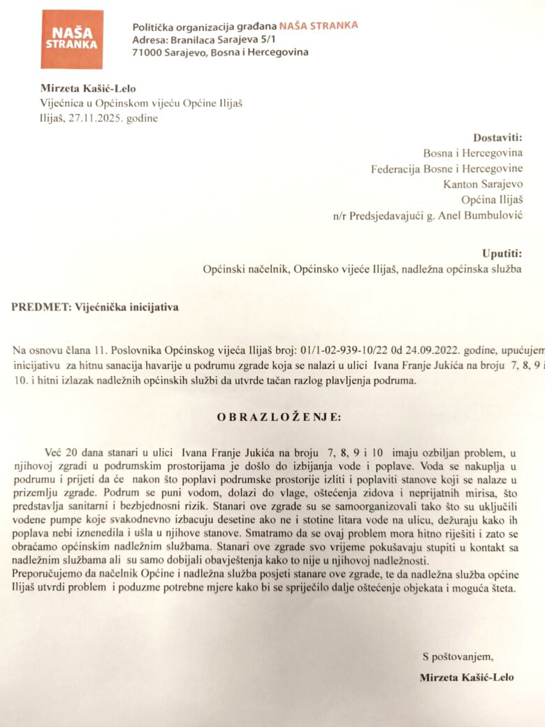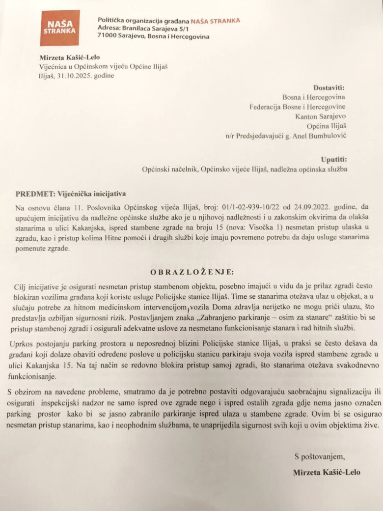 Na jučer održanoj 13. redovnoj sjednici Općinskog vijeća Ilijaš, vijećnica Naše stranke, dr. sc. Mirzeta Kašić Lelo, istakla se aktivnim učešćem podnošenjem četiri značajne vijećničke inicijative. Cilj ovih prijedloga je unapređenje komunalnih uslova, sigurnosti i funkcionisanja lokalne zajednice.