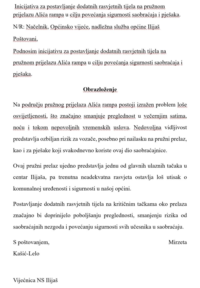 Na jednom od ključnih ulaza u centar Ilijaša, željezničkom prijelazu poznatom kao “Alića rampa”, evidentiran je problem nedovoljne osvijetljenosti. Slaba vidljivost posebno je izražena tokom noći i u uslovima lošeg vremena, čime se povećava rizik od nesreća.