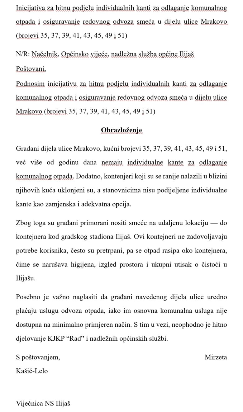 Inicijativom se od nadležnih općinskih službi i KJKP „Rad“ zahtijeva hitna podjela individualnih kanti i osiguravanje urednog i redovnog odvoza, s obzirom na to da građani uredno plaćaju uslugu.