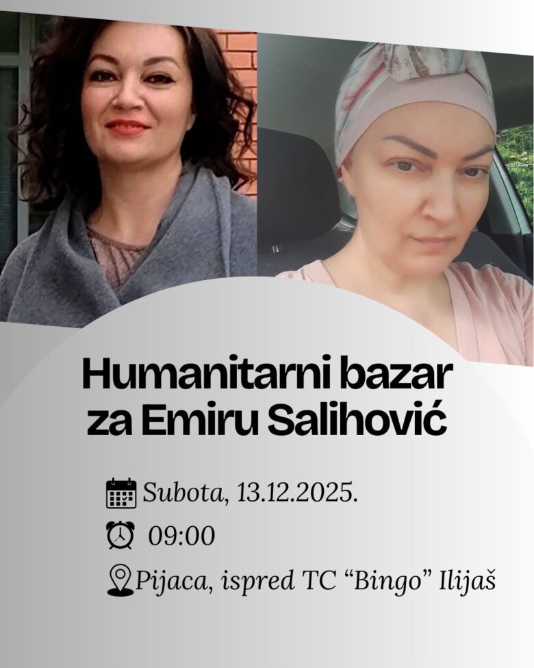 Humanitarni bazar za Emiru Salihović bit će održan u subotu, 13. decembra 2025. godine, s početkom u 9:00 sati, na pijaci ispred TC “Bingo” u Ilijašu. Građani će imati priliku da svojim prisustvom i donacijama pomognu sugrađanki koja se već duže vrijeme bori sa teškim zdravstvenim izazovima.