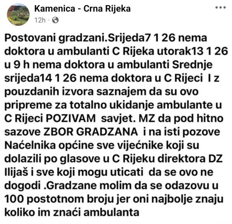 U objavi građana navedeno je da u više navrata početkom januara 2026. godine nije bilo ljekara u ambulanti Crna Rijeka, kao ni u ambulanti Srednje, te je izražena zabrinutost da se radi o pripremama za potpuno ukidanje ambulante. Građani su pozvali Savjet MZ da hitno sazove zbor građana i uključi sve relevantne aktere, ističući koliko im ambulanta znači.