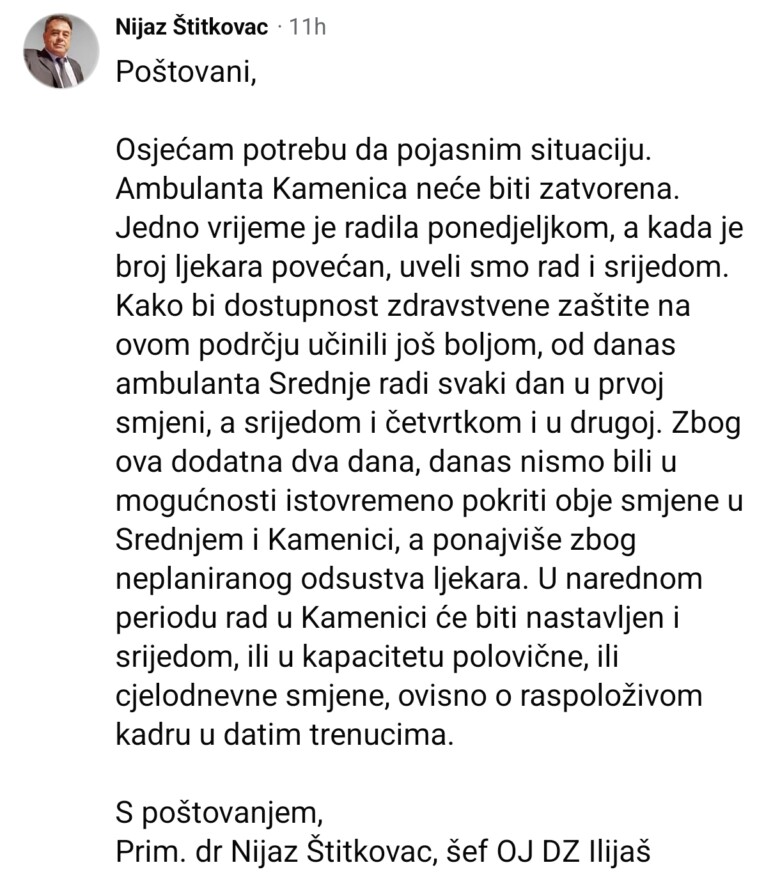 Nakon što je na društvenim mrežama objavljena poruka u kojoj se izražava zabrinutost građana zbog učestalih izostanaka ljekara i mogućeg ukidanja ambulante na području Kamenice – Crne Rijeke, reagovao je Dom zdravlja Ilijaš, demantujući tvrdnje o njenom zatvaranju.