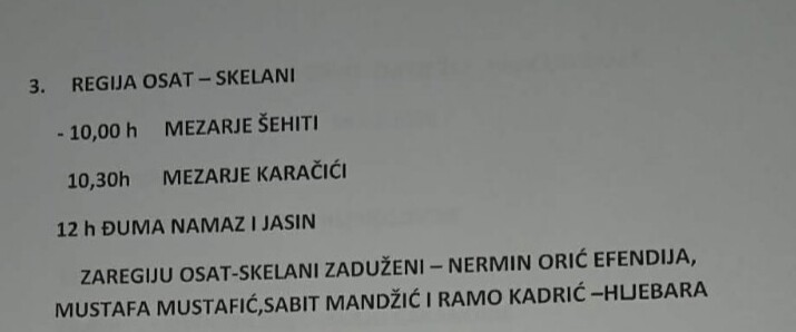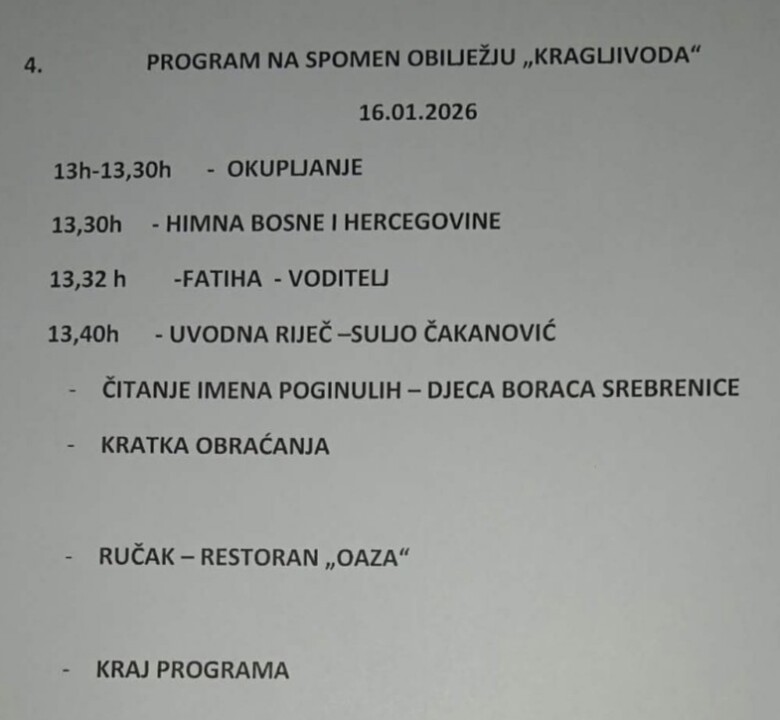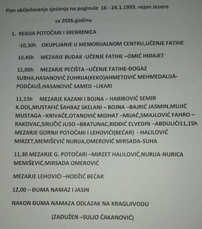 U periodu od 16. do 24. januara 2026. godine, u Podrinju će biti organizovano tradicionalno obilježavanje sjećanja na poginule borce i civilne žrtve iz rejona Jezero, stradale tokom januara 1993. godine. Program obilježavanja obuhvata posjete mezarjima, učenje Fatihe, klanjanje dova i dženaza-namaza (dova/jasin), kao i centralni program na spomen-obilježju Kragljivoda.
