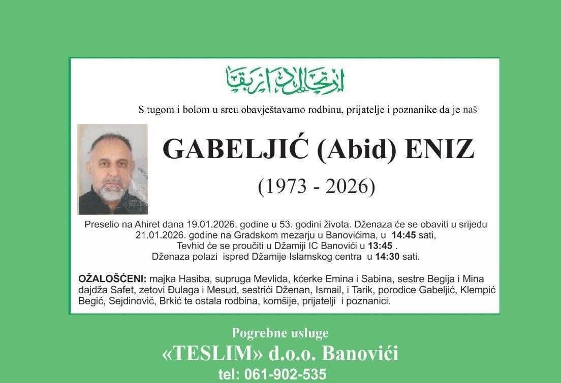 Dženaza će se obaviti u srijedu, 21. januara 2026. godine, na Gradskom mezarju u Banovićima u 14.45 sati. Tevhid će se proučiti u Džamiji Islamskog centra Banovići u 13.45 sati, a dženaza polazi ispred džamije u 14.30 sati.