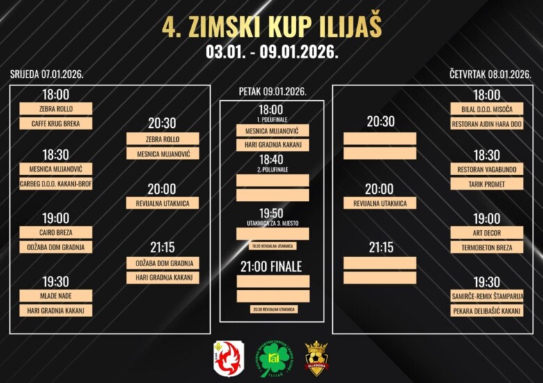 U petak 9. januara, u Sportskoj dvorani “Rašid Buća” u Ilijašu bit će upriličeno svečano zatvaranje turnira u malom fudbalu „Zimski kup Ilijaš“. U okviru završnice turnira na rasporedu su posljednje i najuzbudljivije utakmice – polufinalni susreti, meč za treće mjesto, kao i veliko finale koje će odlučiti ovogodišnjeg pobjednika.