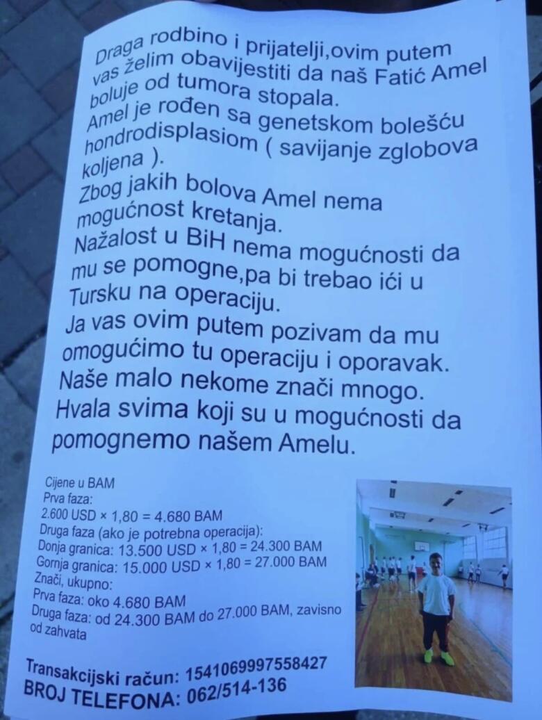 Nažalost, u Bosni i Hercegovini nema mogućnosti da mu se pomogne pa bi zbog toga trebao ići u Tursku na operaciju.