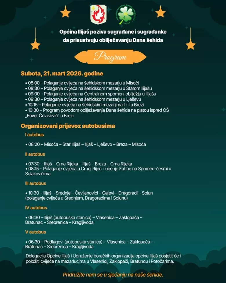 Povodom obilježavanja Dana šehida, Općina Ilijaš u saradnji sa Udruženjem boračkih organizacija općine Ilijaš organizuje prigodan program odavanja počasti šehidima i poginulim borcima, koji će biti održan u subotu, 21. marta 2026. godine.