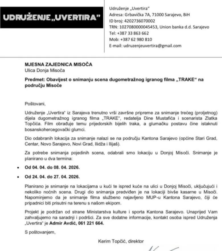 Na području Mjesne zajednice Misoča uskoro počinje snimanje dugometražnog igranog filma „Trake“, čime ova lokalna zajednica postaje jedna od lokacija važnog filmskog projekta u Kantonu Sarajevo.